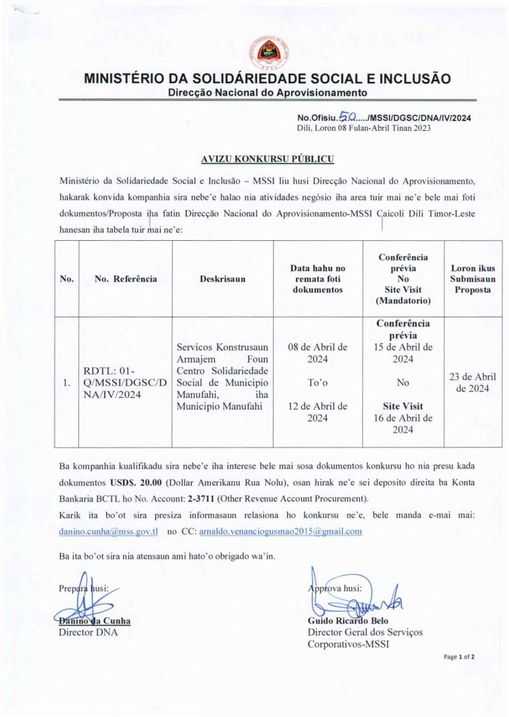 Ministério Solidariedade Social e Inclução (MSSI) Liu husi Diresao Nasional Aprovisionamento hakarak konvida kompania sira ne’ebe mak halo katividade negosio tuir mai ne’e bele mai foti documentus/proposta iha fatin Direção Nasional do Aprovisionamento MSSI Caicoli,Dili,Timor-Leste hanesan iha tabela Tuir Mai ne’e