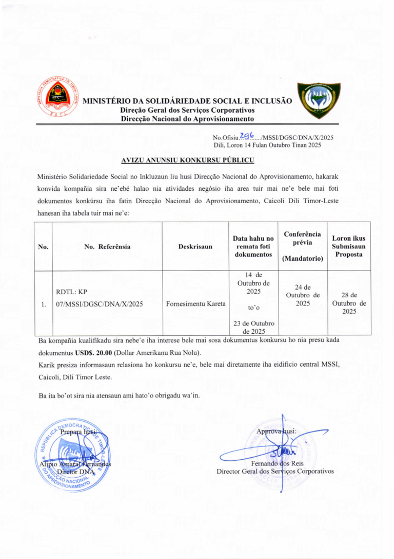 Ministério Solidariedade Social no Inkluzaun liu husi Direcção Nacional do Aprovisionamento, hakarak konvida kompañia sira neʼebé halao nia atividades negósio iha area tuir mai ne’e bele mai foti dokumentos konkúrsu iha fatin Direcção Nacional do Aprovisionamento, Caicoli Dili Timor-Leste hanesan iha tabela tuir mai ne’e: