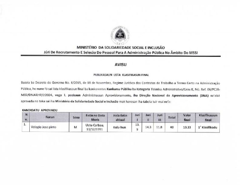 Bazela ba Decreto do Governo No. 6/2015, de 18 de Novembro, Regime Juridico dos Contratos de Trabalho a Termo Certo na Administração Pública, ho nune fo sai lista klasifikasaun final ba konkorentes Kunkursu Públiku ba Kategoria Tekniku Administrativo/Grau E, Nú. Ref. 06/PCIR- MSSI/DNARHP/1/2024, vaga 1. pozisaun Administrasaun Aprovisionamento, iha Direção Nacional do Aprovisionamento (DNA) ne’ebe aprovadu no taka sai iha Ministério da Solidariedade Social e Inclusão mak hanesan iha tabela tuir mai ne’e: