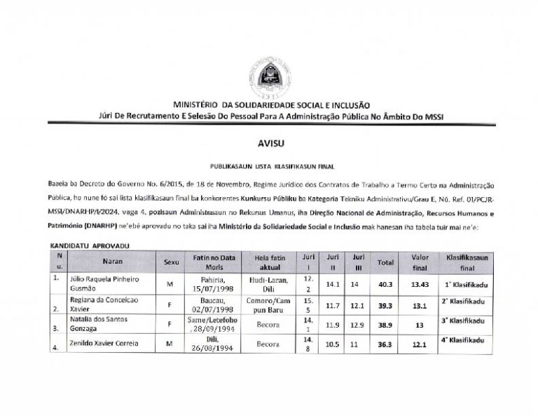 Bazela ba Decreto do Governo No. 6/2015, de 18 de Novembro, Regime Jurídico dos Contratos de Trabalho a Termo Certo na Administração Pública, ho nune to sai lista klasifikasaun final ba konkarentes Kunkursu Públiku ba Kategoria Tekniku Administrativu/Grau E, No. Ref, 01/PCJR- MSSI/DNARHP/I/2024, vaga 4, pozisaun Administrasaun no Rekursus Umanus, iha Direção Nacional de Administração, Recursos Humanos e Património (DNARHP) ne’ebé aprovadu no taka sai ina Ministério da Solidariedade Social e Inclusão mak hanesan iha tabela tuir mai ne’e: