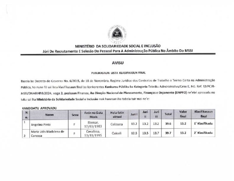 Bazeia ba Decreto do Governo No. 6/2015, de 18 de Novembro, Regime Juridico dos Contratos de Trabalho a Termo Certo na Administração Pública, ho nune fó sai lista klasifikasaun final ba konkorentes Kunkursu Públiku ba Kategoria Tekniku Administrativu/Grau E. Nó. Ref. 12/PCJR- MSSI/DNARHP/1/2024, vaga 2. pozisaun Finansas, iha Direção Nacional de Planeamento, Finanças e Orçamento (DNPFO) neʼebé aprovadu no taka sai iha Ministério da Solidariedade Social e Inclusão mak hanesan iha tabela tuir mal ne’e: